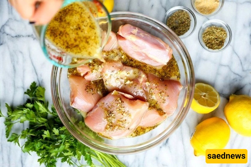 الطریقه الصحیحه هی تغطیه قطع الدجاج أولًا بالزیت، ثم إضافه الملح وعصیر اللیمون لاحقًا حتى لا یتصلب اللحم أثناء التتبیل الطویل.