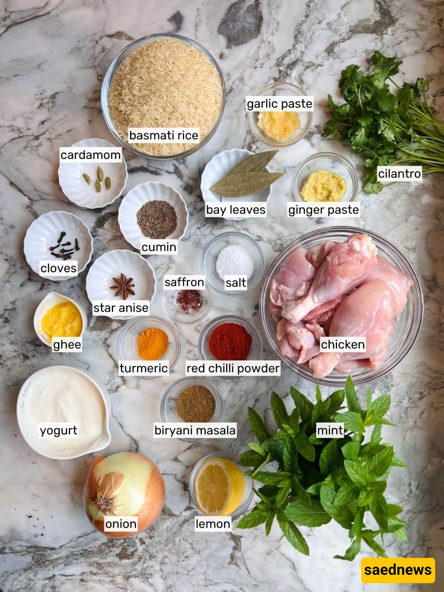 وفقًا لـ ساعدنیوز ، کل ما تحتاجه لتحضیر ألذ بریانی دجاج هو: أرز بسمتی عطری، دجاج بالعظم، بهارات کامله، فلفل کشمیری حار، أعشاب طازجه، وبالطبع السمن البلدی (الـGhee) المنزلی. کل مکوّن یلعب دوره فی صناعه سحر البریانی الشهیر.