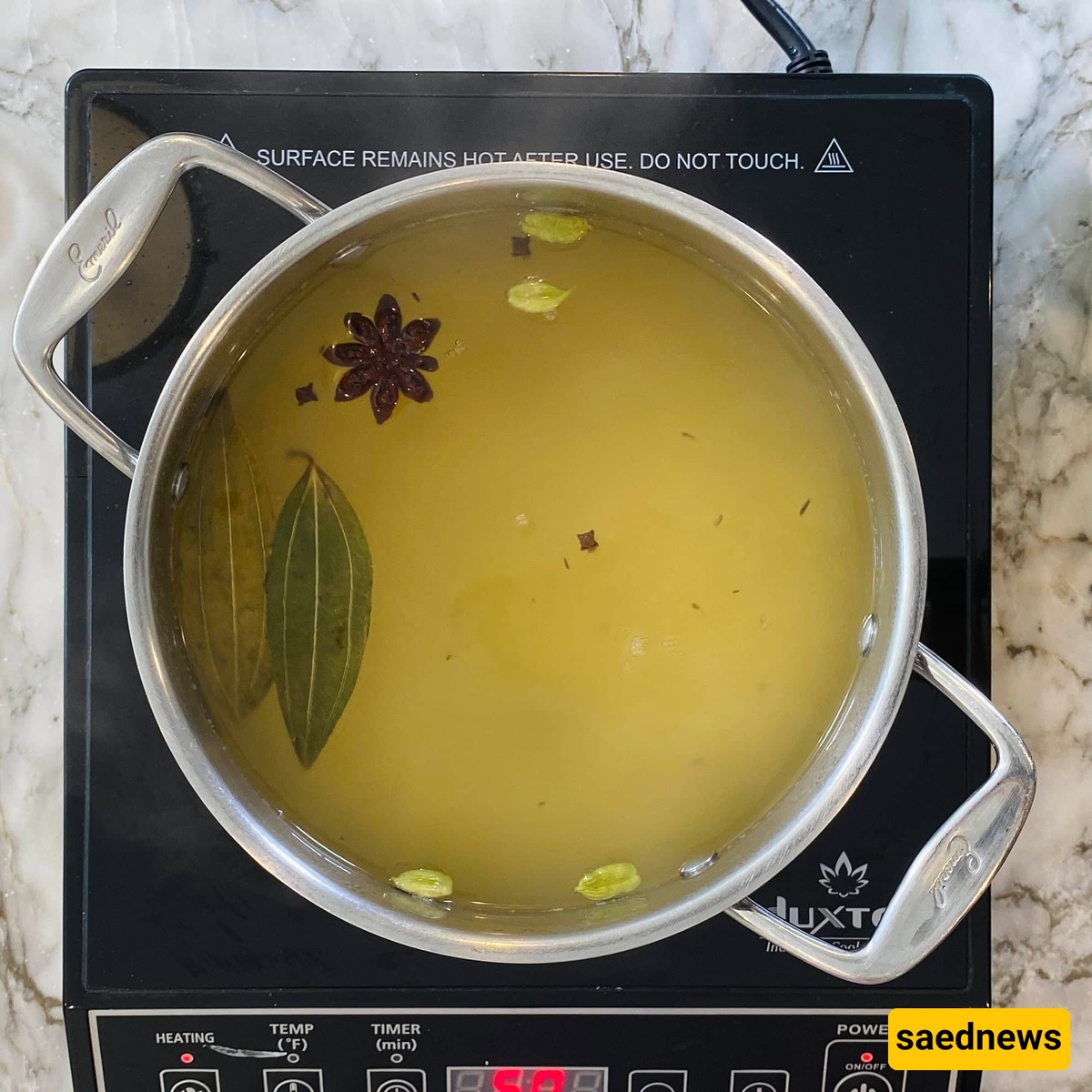 اغلِ الماء وأضف الکمون، ورق الغار، الیانسون النجمی، الهیل، القرنفل، والملح.