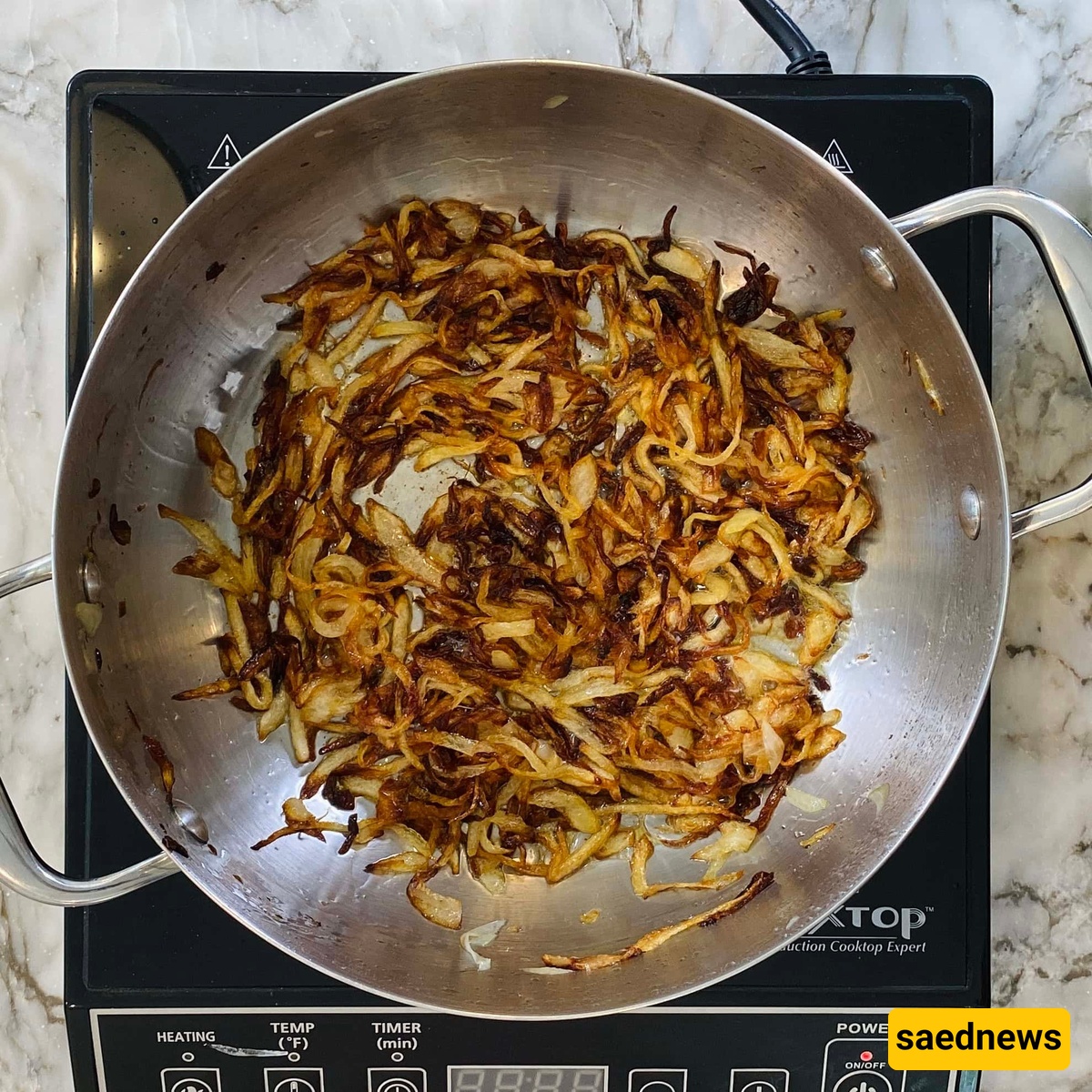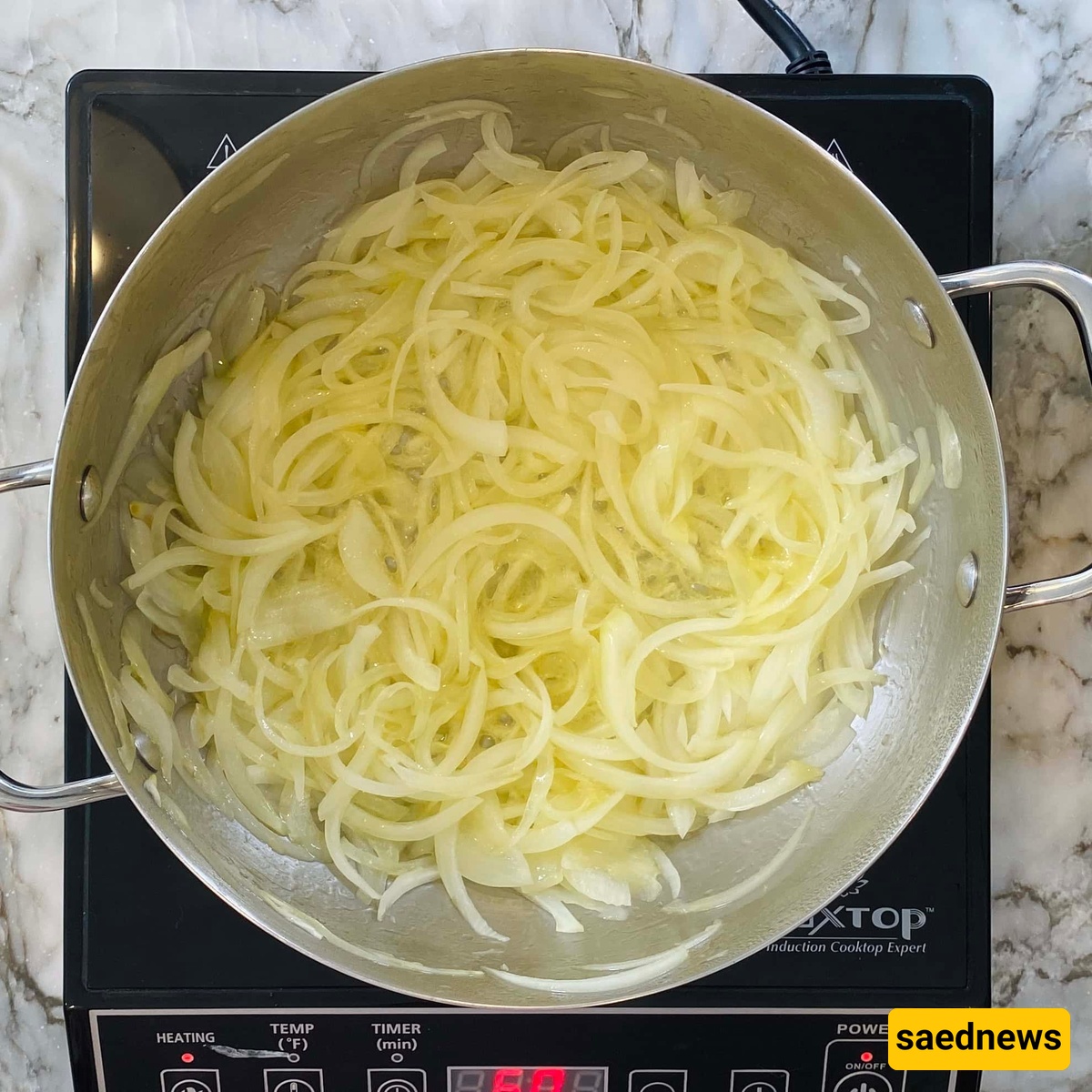 أضف شرائح البصل وقلّب على نار متوسطه لمده 15–20 دقیقه حتى یصبح ذهبیًا ومقرمشًا.