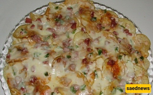 یُحضّر طبق مناسب للفرن، وتُوضع طبقه من رقائق البطاطس مع الضغط علیها قلیلًا.