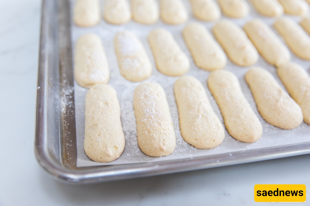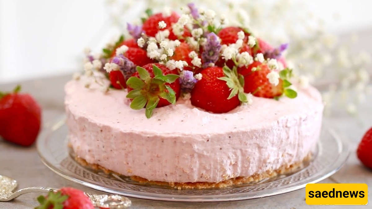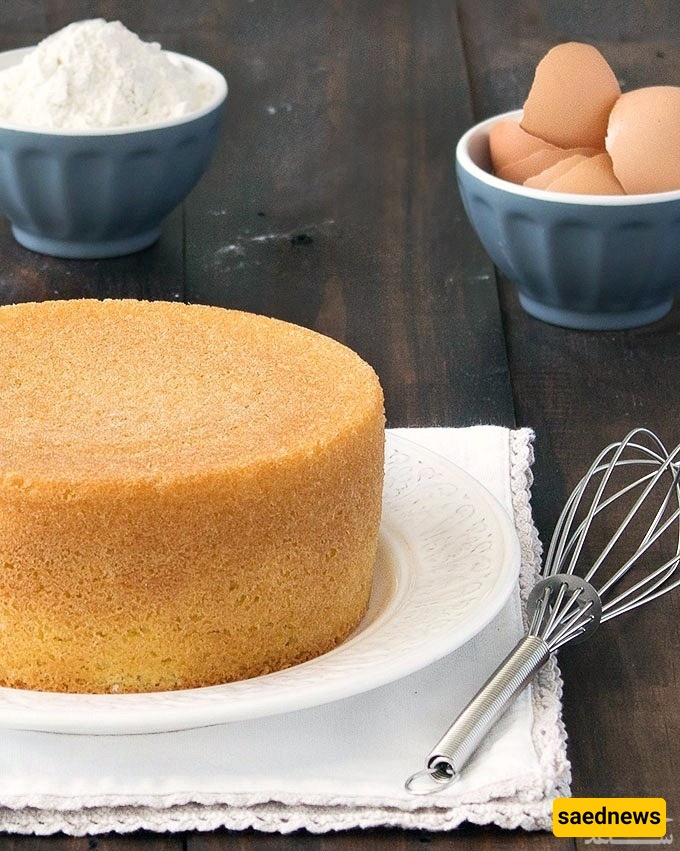 یُعتمد على خفق البیض جیدًا لإدخال الهواء، ویُخبز حوالی 60 دقیقه على 180°C.