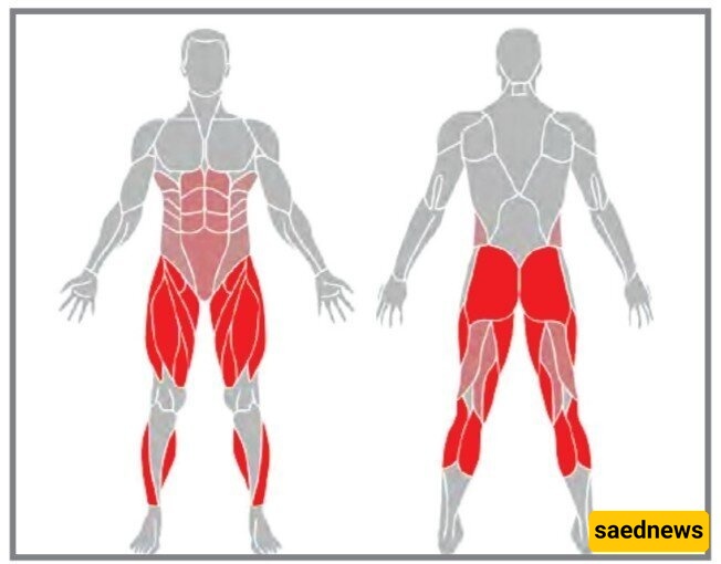 فی المخطط التوضیحی، تظهر العضلات الرئیسیه التی یعمل علیها التمرین باللون الأحمر الداکن، بینما العضلات الثانویه الأقل مشارکه باللون الأحمر الفاتح.