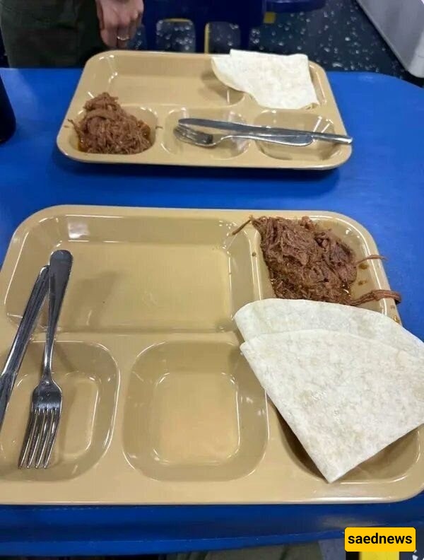 على متن USS Tripoli، تُظهر صوره صینیه الغداء أنها فارغه تقریبًا من ثلثیها، ولا تحتوی سوى على “کمیه صغیره من اللحم المفروم وقطعه مطویه من خبز التورتیلا”.