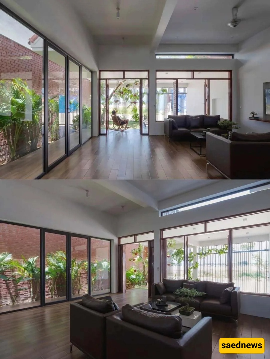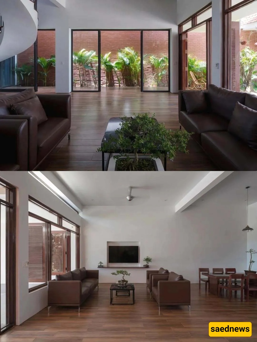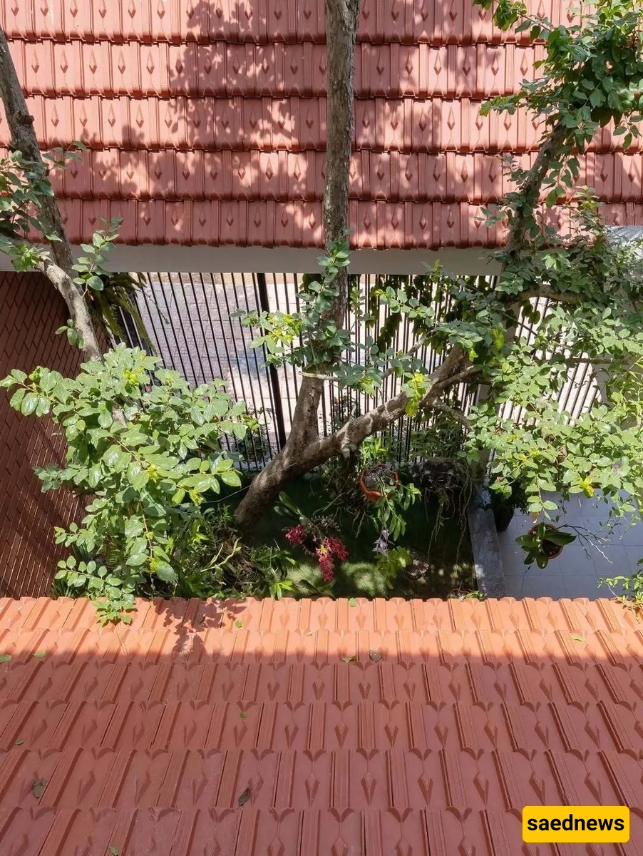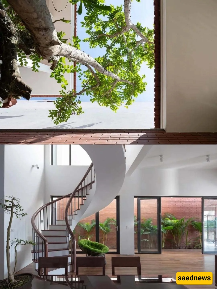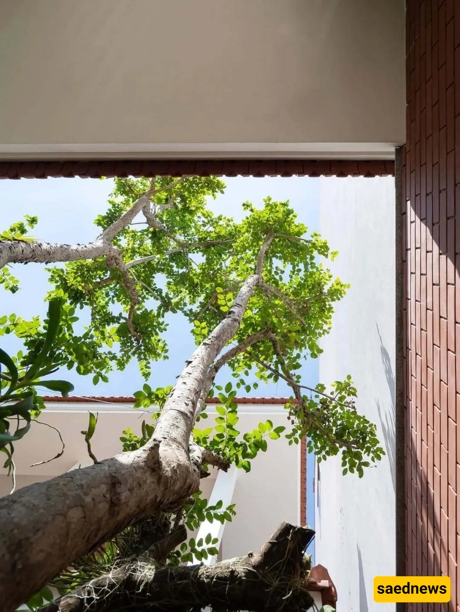 من أبرز الابتکارات فی هذا التصمیم إزاله جزء من السقف لتشکیل فناء مفتوح ومضیء. یتیح هذا الفراغ الداخلی للأشجار المزروعه فی الحدیقه النمو بحریه، مع توفیر ظل طبیعی یغطی أجزاء من المنزل. کما یعزز هذا الفتح التهویه الطبیعیه والإضاءه النهاریه داخل المبنى، فی إشاره إلى التعایش الوثیق بین الإنسان والطبیعه.