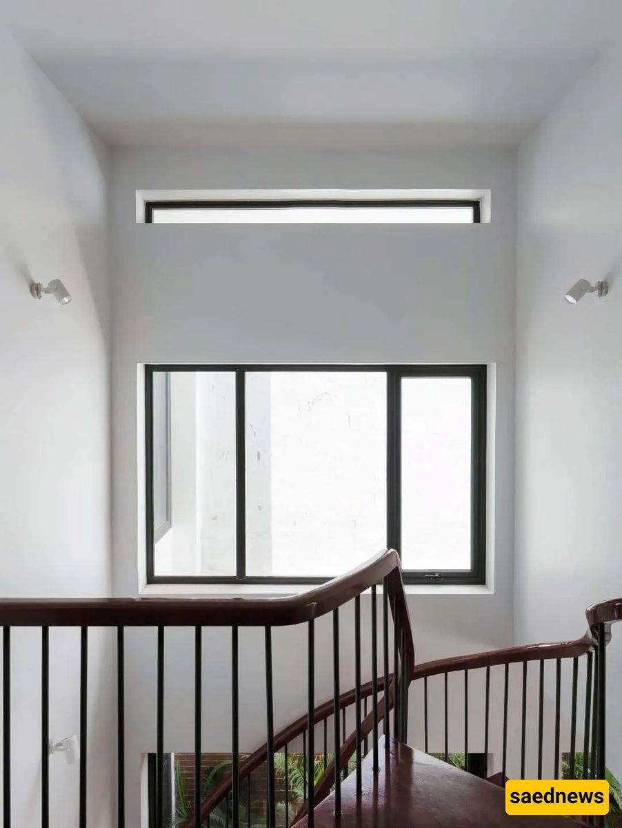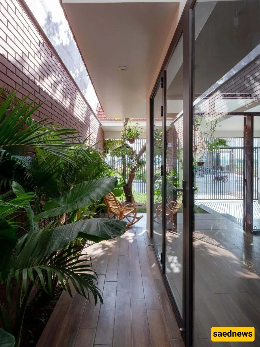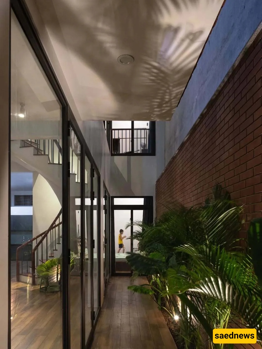 على الرغم من ضیق عرض الأرض، تمکّن المصمم من معالجه تحدیات الإضاءه والتهویه من خلال إنشاء أفنیه مفتوحه فی الواجهه وعلى جانبی المنزل. وتعمل هذه الفراغات الخارجیه کعازل بین المنزل والشارع، مستوحاه من الطرازات السکنیه التقلیدیه فی جنوب شرق آسیا، مما یسهم فی خلق بیئه حضریه أکثر ملاءمه للعیش.