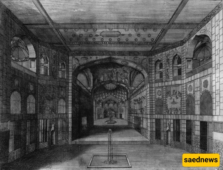 القاعه المرکزیه: أعمده مزخرفه ونقوش دقیقه تفتح الطریق إلى جمال الداخل.